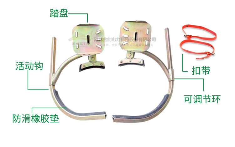 金能腳扣配有可調節套環,腳扣可以靈活調節。腳扣借助人身重量,緊扣電線桿,產生較大的摩擦力,易于攀登,操作輕巧。