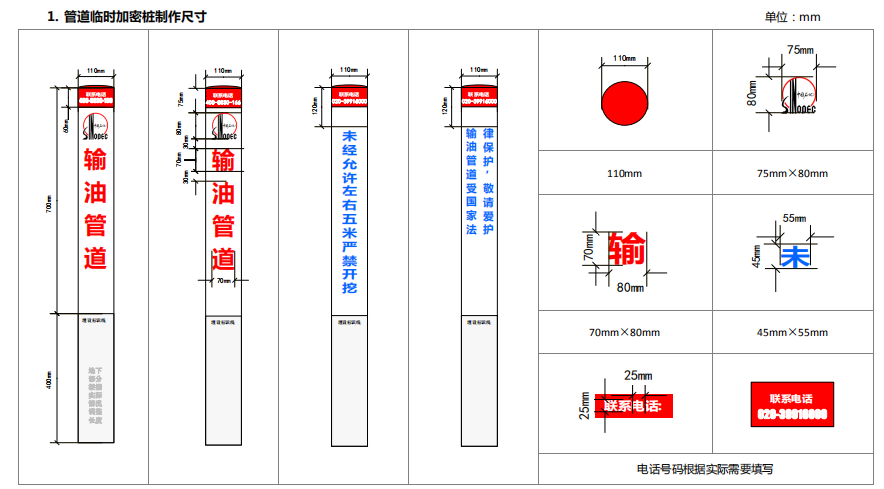 臨時加密樁材料: ø110mm×3mm×1100mm PVC 管制作,標(biāo)識的內(nèi)容用戶外漆絲印。